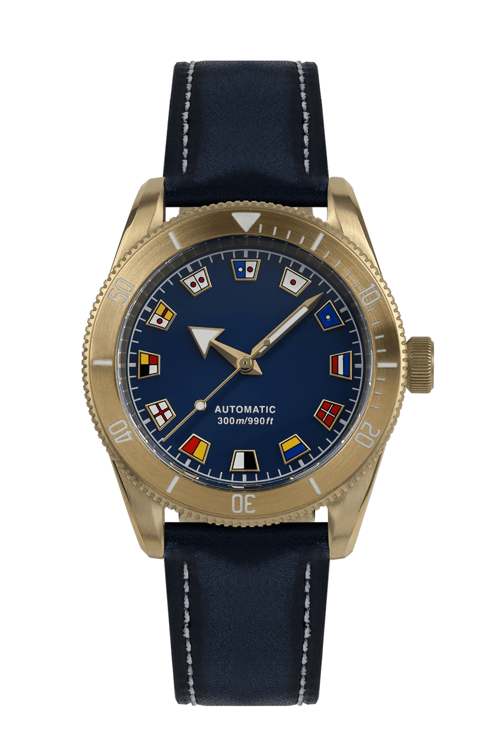 Descrizione: quadrante opaco, indici applicati con bandiere nautiche stampate e lancette con inserti luminosi